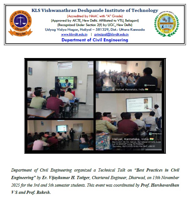 The Department of Civil Engineering organized a Technical Talk on “Best Practices in Civil Engineering” by Er. Vijaykumar H. Totiger, Chartered Engineer, Dharwad, on 13th November 2025 for the 3rd and 5th semester students.