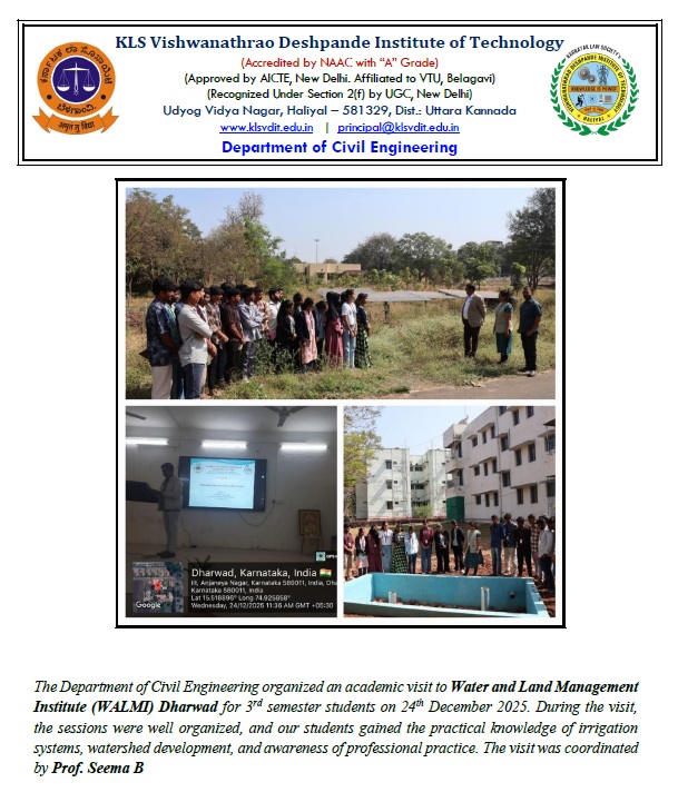 The Department of Civil Engineering organized an academic visit to Water and Land Management Institute (WALMI) Dharwad for 3rd semester students on 24th December 2025.