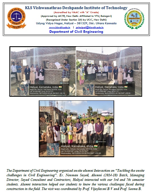 The Department of Civil Engineering organized onsite alumni Interaction on “Tackling the onsite challenges in Civil Engineering”. Er. Nouman Sayed, Alumni (2014-18) Batch, Managing Director, Sayed Consultant and Contractors, Haliyal interacted with 3rd and 7th semester students on 19th November 2025.