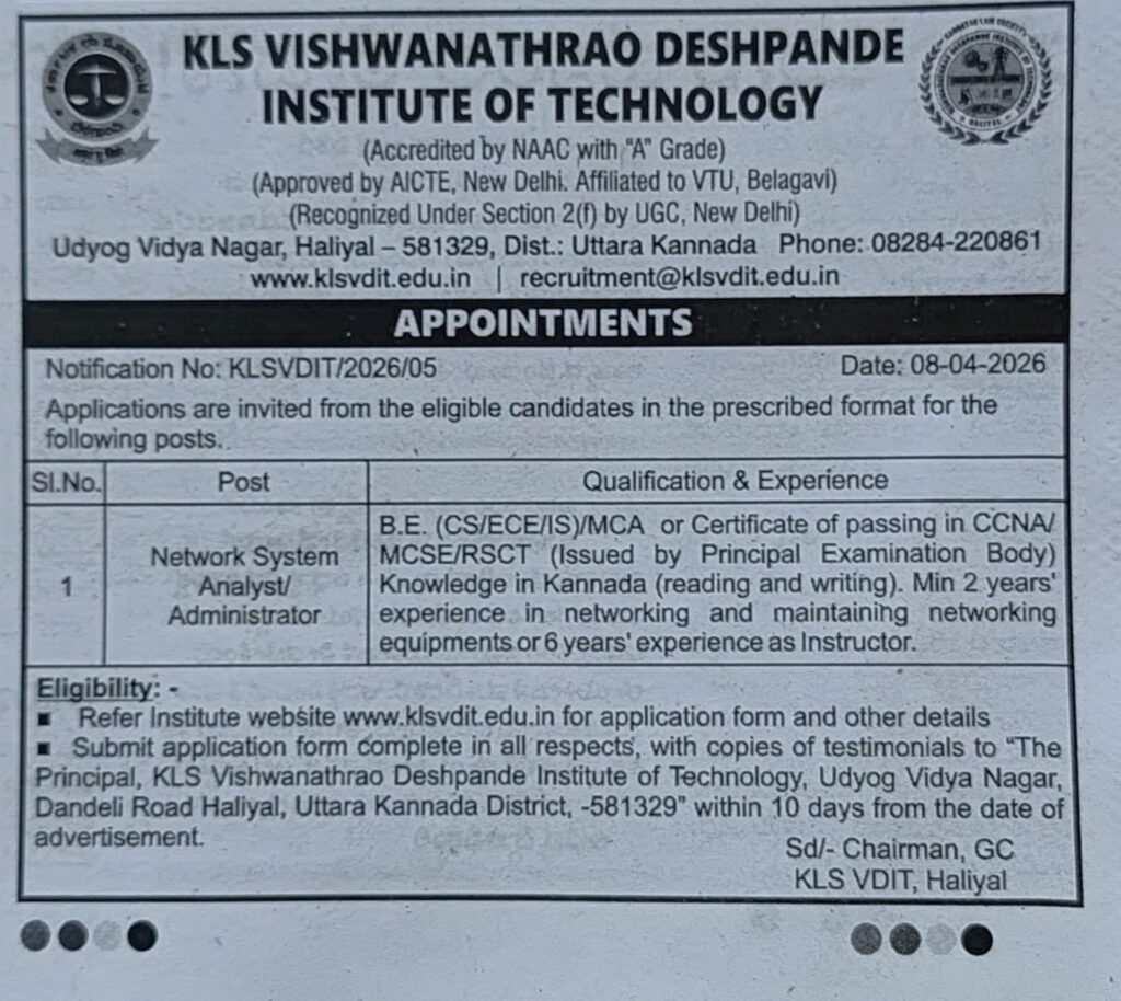 Recruitment for the post of Network System Analyst / Administrator, dated 08/04/2026